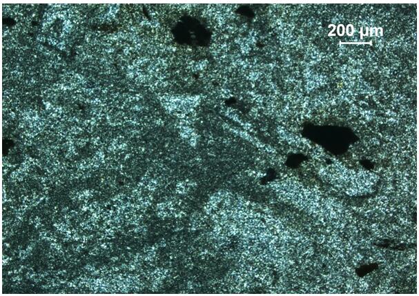 照片3 粒度普遍小于0. 5μm的微粒狀玉髓緊密鑲嵌,粒間可見