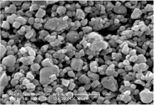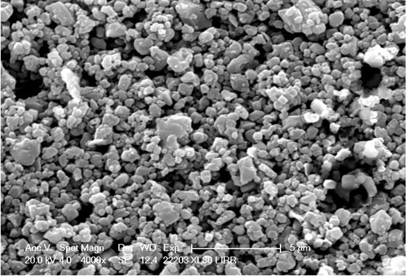 圖2-4為多孔粉石英的8000×掃描電鏡像。圖中可知樣品主要由粒徑為2微米以下的細小顆粒堆積組成。