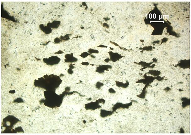 照片6 形態(tài)多變的有機(jī)質(zhì)(黑色)集合體散布在由玉髓(無色透明)