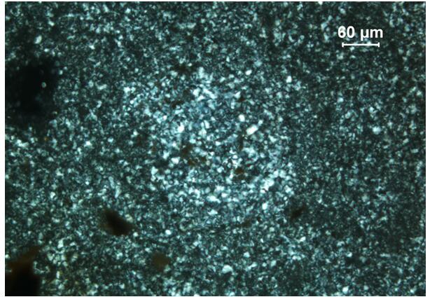 照片4 由脫水作用形成的微細(xì)石英(中上部左側(cè))與圓粒狀玉髓混雜交生