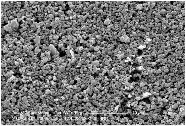 圖2-2為多孔粉石英的2000×掃描電鏡像。由圖可以推斷,樣品主要由粒徑小于2微米的細小顆粒組成。
